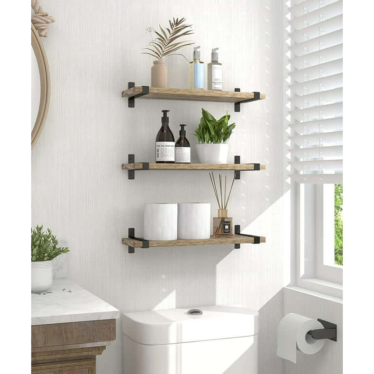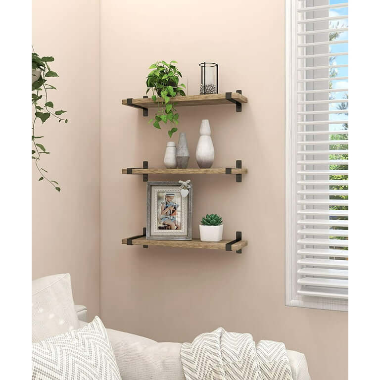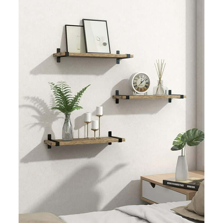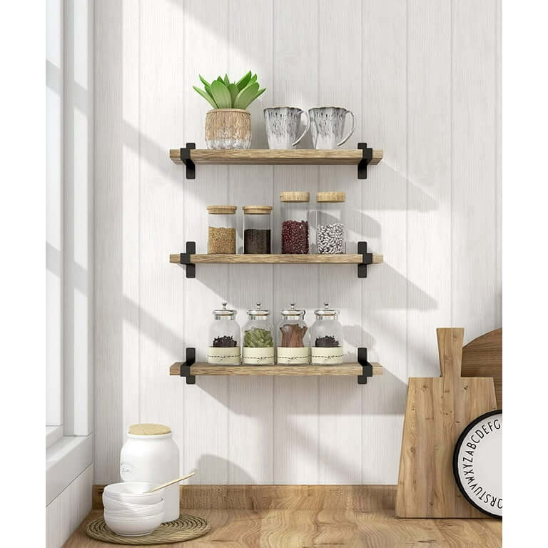 Rustic Wood Floating Shelves Wall Mounted Set of 3, Small Light Decorative Storage Shelf with U Metal Brackets, 2.86 lb, Display for Bedroom Living Room Bathroom Kitchen Office Home Decor. A set of 3 shelves that you can combine at will to provide you with greater storage capacity, Floating Shelves made of solid wood with U-shaped brackets for better stability, are perfect for a classic rustic modern farmhouse style home. An exquisite decoration in bathroom, living room, kitchen, bedroom, corner or office.