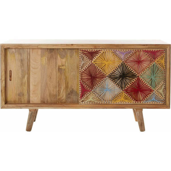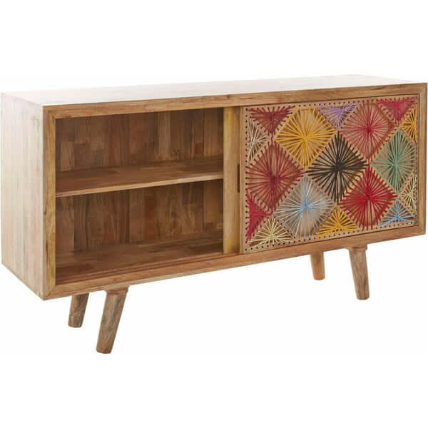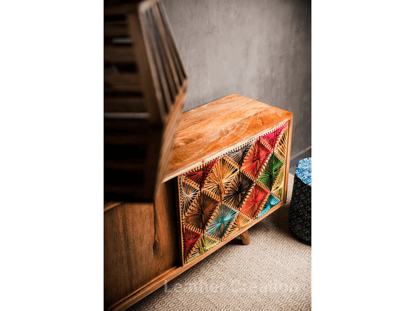 It has 1 door covered with a weave of colored cotton threads. Placed in different living environments, it is equipped with internal shelves. The fusion of solid wood and hand waving pattern makes this product unique.