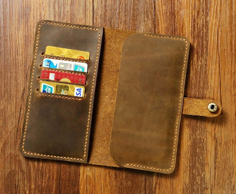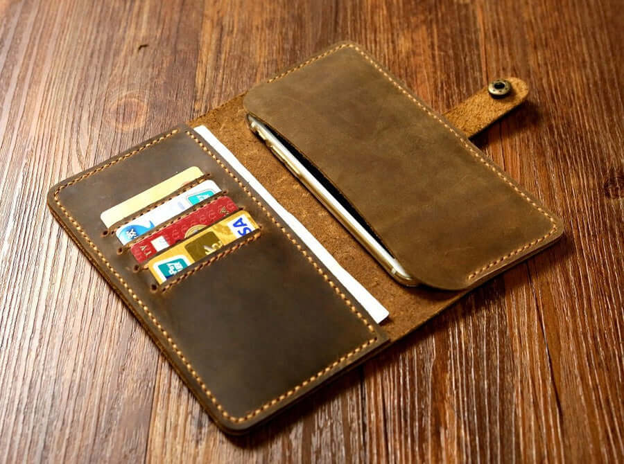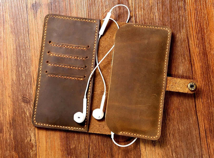 This phone wallet case is made from high-quality genuine distressed leather ,Hand sew with thick waxed thread ,so the amazing hand stitch is the one of most feature for this phone wallet, this phone wallet sturdy, practical and will be aged beautifully over time.