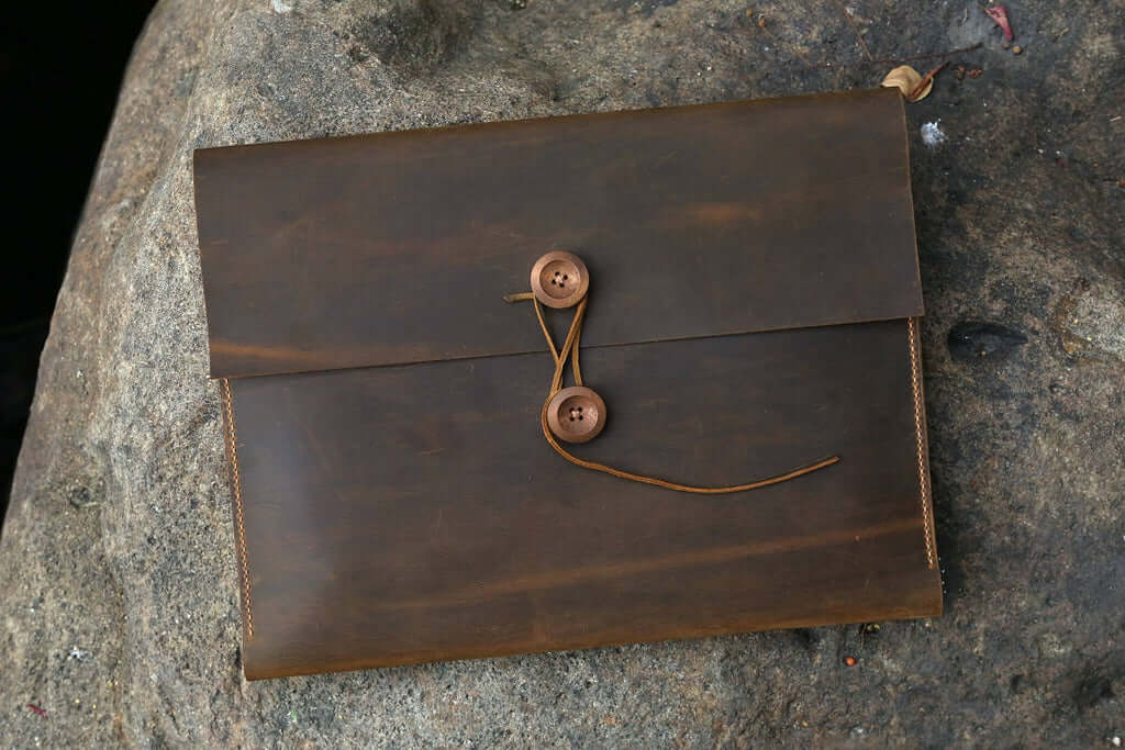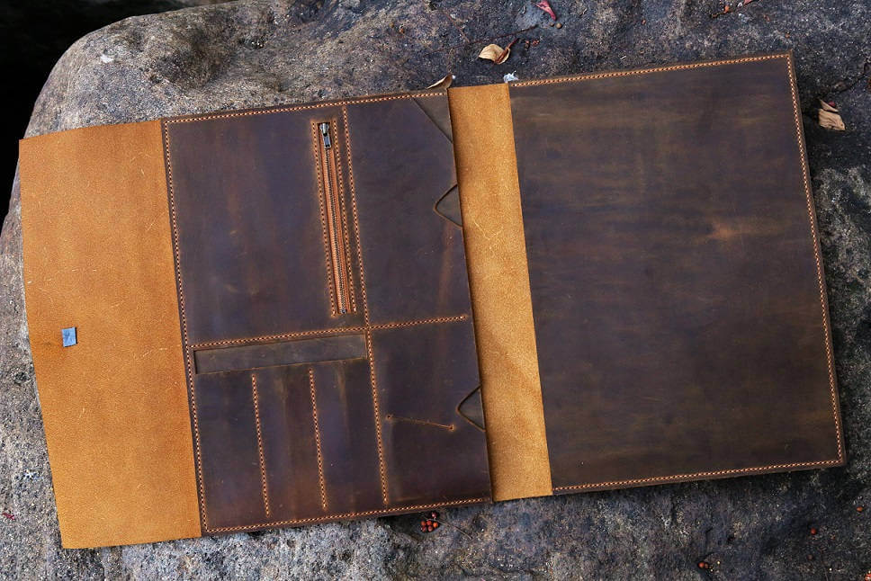 This leather portfolio was designed for your travel or business trip ,high quality top grain cow leather and 100% hand cut and sew . you could organize your stuff and laptop into it .
