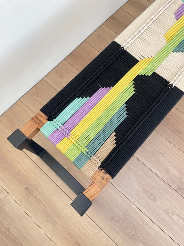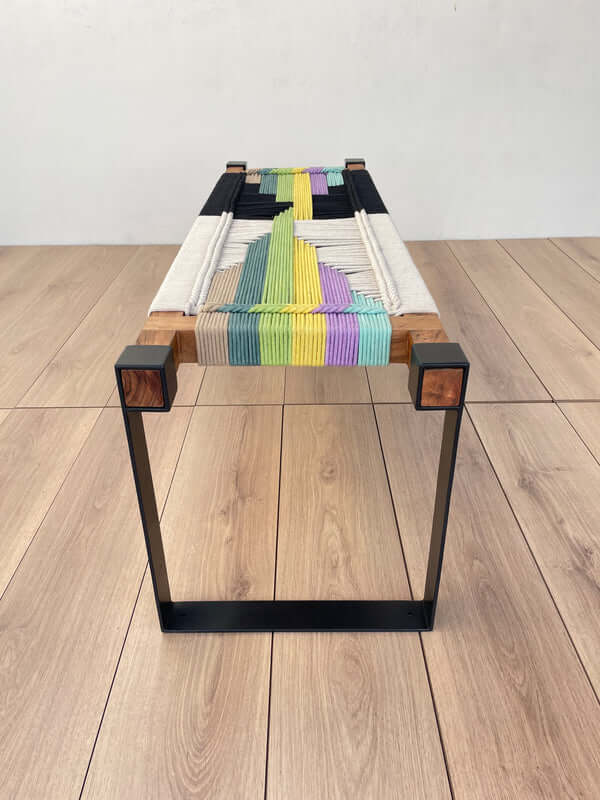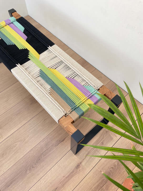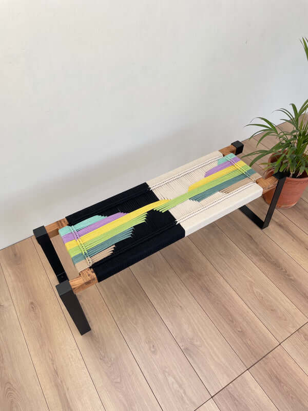 The woven bench is a handmade piece that brings a unique and stylish look to any entryway or living space. Each bench is crafted with care using a weaving technique with cotton cord and natural finish wood that is beautiful, functional and lasts for many years.