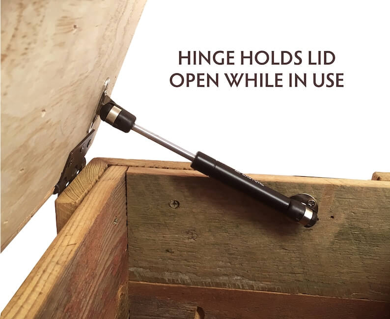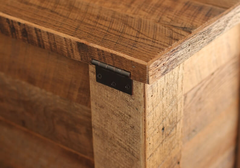 Also works great as a storage bench or cabinet. It’s clean and simple design mixed with the character of reclaimed wood makes it work in a variety of decor styles. The lid is plenty sturdy to sit on. Solid wood storage has a special hinge that holds the lid open when in use.