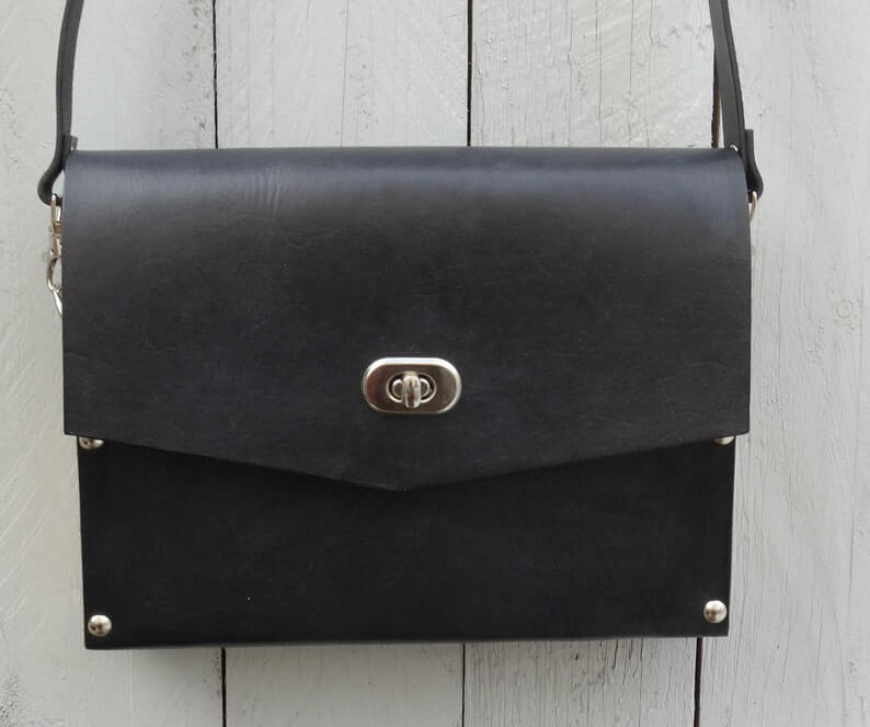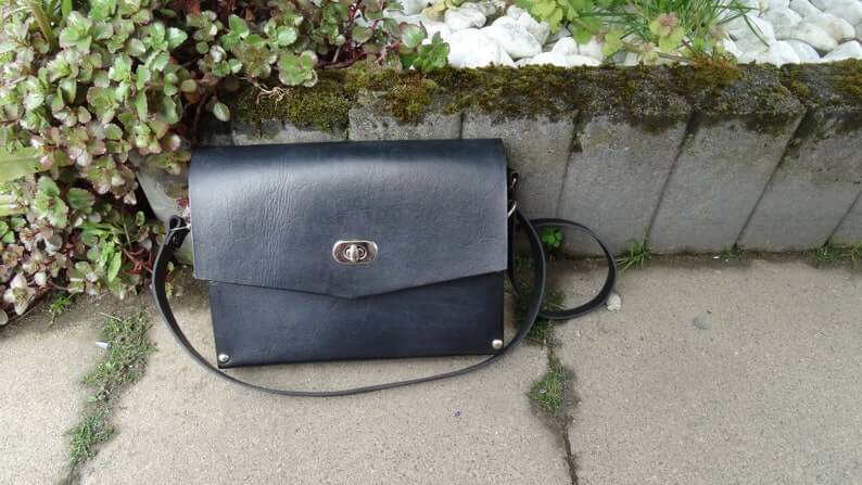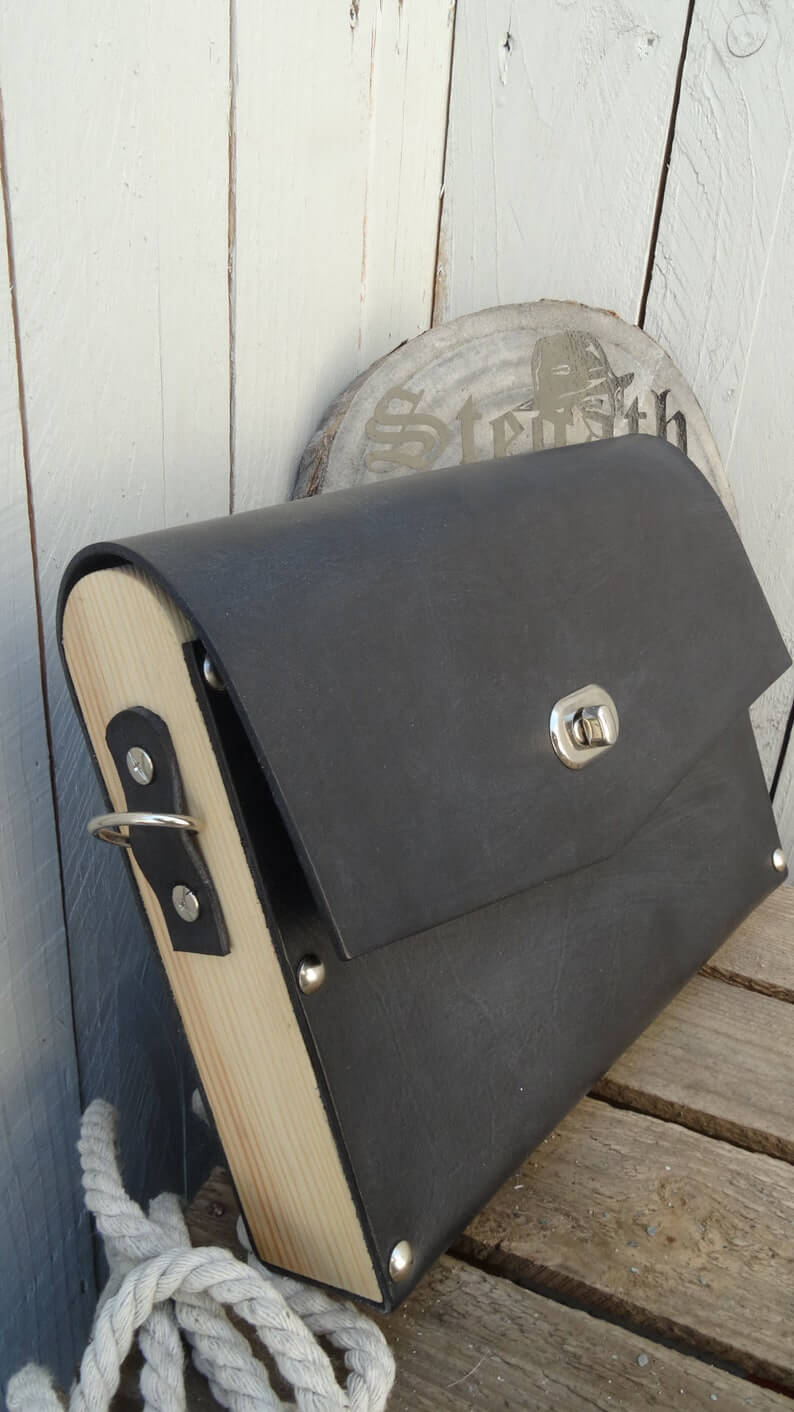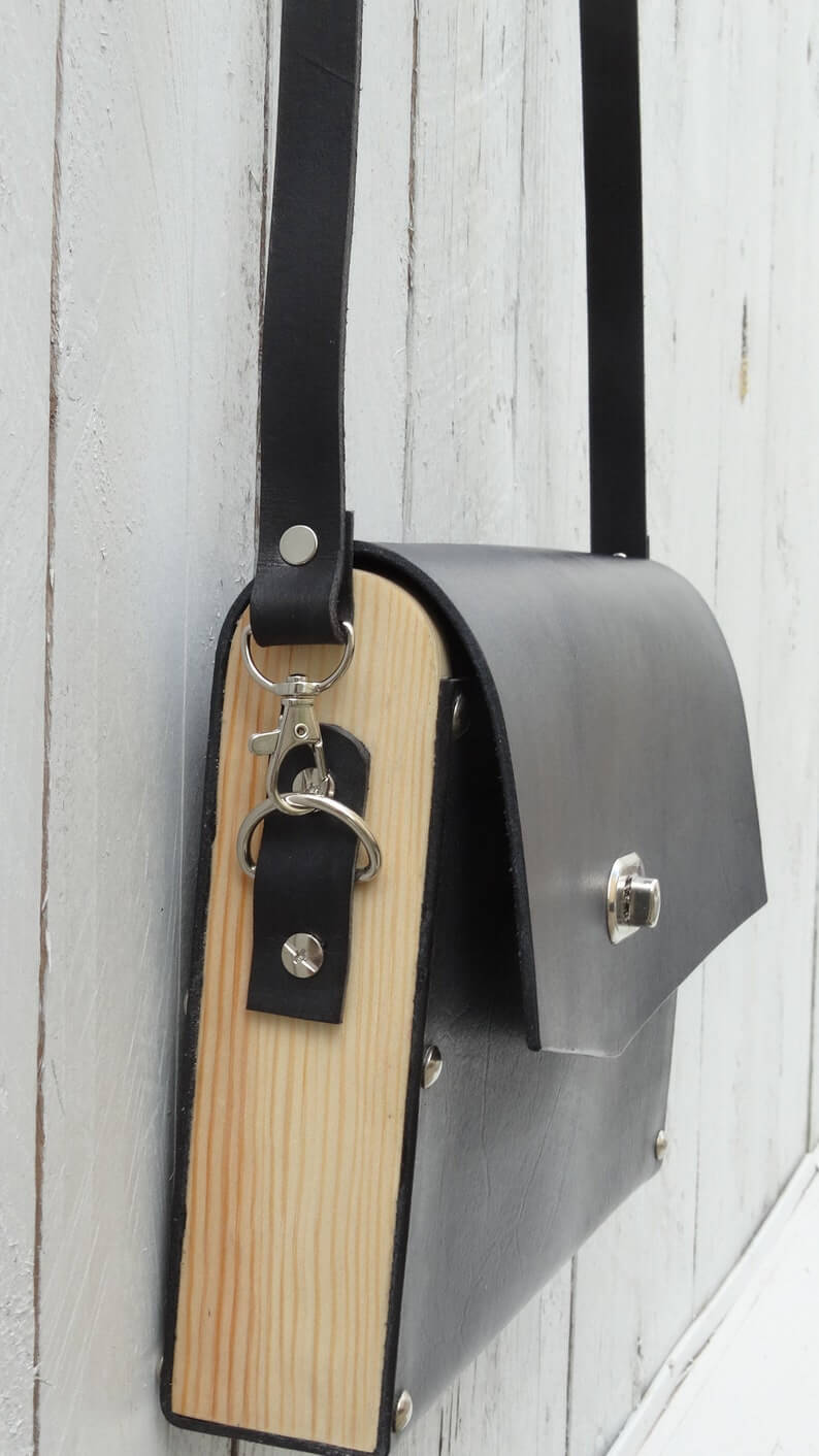 The belt length / carrying strap can be adjusted in length. The bag is a small space wonder and holds space for everything the woman needs. The bag is completely hand sewn and dyed in black, the side parts are made of wood and therefore unique.
